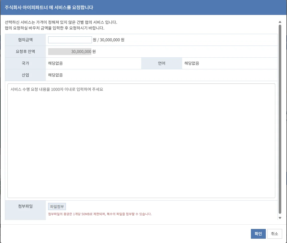 이 글은 충분한 상담을 통해, 주식회사 아이피파트너를 이미 수행기관으로 선택하신 경우 온라인 상에서 계약을 체결하고, 서비스를 요청하는 절차를 정리한 글입니다.