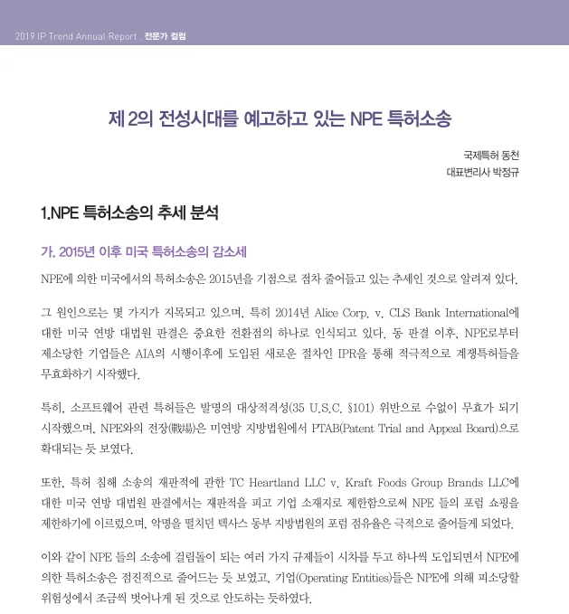 지식재산처 간행물 페이지에서 확인할 수 있는 『2019 IP Trend(국제 지재권분쟁동향 연차보고서)』 의 「제2의 전성시대를 예고하고 있는 NPE 특허 소송」전문가 칼럼은 2010년대 중반에 크게 증가했던 특허괴물, NPE에 의한 해외 지재권 분쟁에 대한 분석과 향후 예측을 담은 글로서,