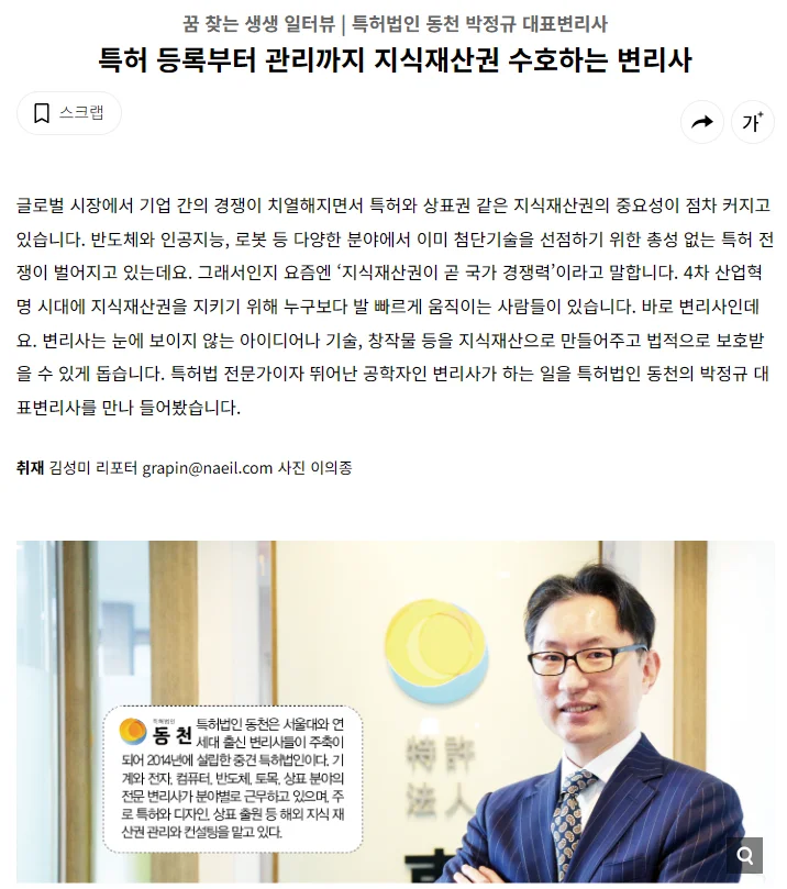 2024년 3월에는 해외 지재권을 전문으로 다루는 변리사에 대하여 소개하고 싶다는 전문 매체 내일교육에의 요청이 있어「특허 등록부터 관리까지 지식재산권 수호하는 변리사」라는 제목으로 인터뷰가 진행되었습니다.
