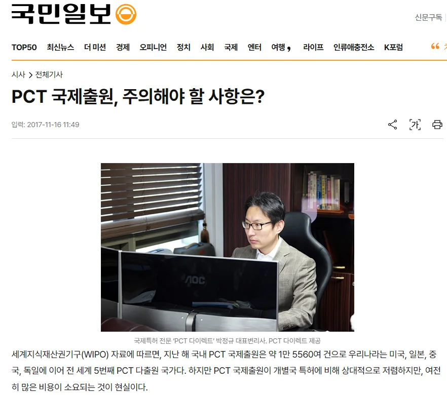 이외에도 주로 해외 지재권을 다루는 저의 견해를 묻는 언론 요청이 있었고 다양한 신문 기사를 통해 해외출원을 어떻게 준비해야 하는지, 그리고 PCT 국제출원을 실무에서 어떻게 활용할 수 있는지에 대한 제 관점이 소개되었습니다.
